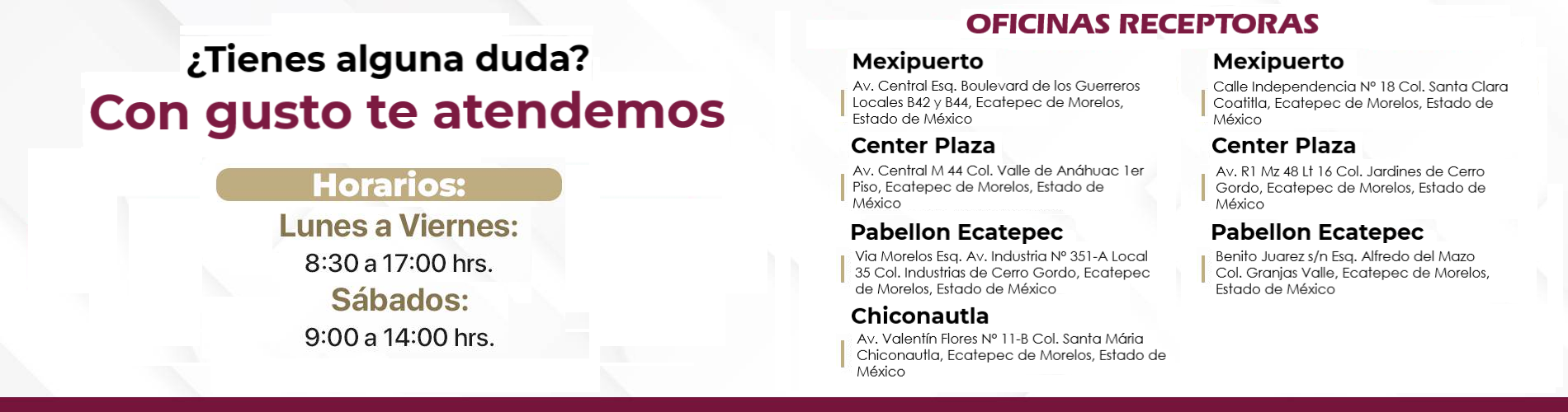 Oficinas Receptoras Chiconaultla Av. Valentín Flores N° 11-B Col. Santa Mária Chiconautla, Ecatepec de Morelos, Estado de México Santa Clara Calle Independencia N° 18 Col. Santa Clara Coatitla, Ecatepec de Morelos, Estado de México Ciudad Azteca Av. R1 Mz 48 Lt 16 Col. Jardines de Cerro Gordo, Ecatepec de Morelos, Estado de México Granjas Valle Benito Juarez s/n Esq. Alfredo del Mazo Col. Granjas Valle, Ecatepec de Morelos, Estado de México Mexipuerto Av. Central Esq. Boulevard de los Guerreros Locales B42 y B44 Plaza Mexipuerto, Ecatepec de Morelos, Estado de México Center Plaza Av. Central M 44 Col. Valle de Anáhuac 1er Piso Centro Comercial Center Plaza, Ecatepec de Morelos, Estado de México Pabellón Ecatepec Via Morelos Esq. Av. Industria N° 351-A Local 35 Col. Industrias de Cerro Gordo, Centro Comercial Pavellón Ecatepec, Ecatepec de Morelos, Estado de México